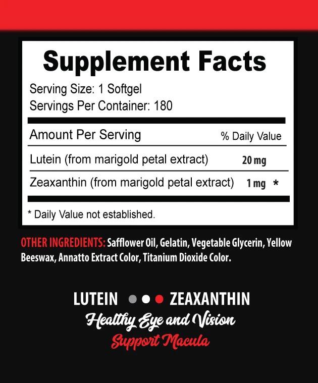 LUTEIN EYE HEALTH SUPPORT SUPPORTS HEALTHY VISION ENHANCES EYE FUNCTION ANTIOXIDANTS ALSO SUPPORT YOUR EYES ANTI-INFLAMMATORY COMPOUNDS PRESENT ANTI FREE RADICAL CAN SUPPORT YOUR SKIN AS WELL LUTEIN 20MG: Fruits and vegetables are the most significant source of natural lutein and zeaxanthin. This natural supplement has extracts from marigold petals for lutein and zeaxanthin. Enjoy the benefits! LUTEIN 20MG READILY SUPPORTS EYE HEALTH: Good nutrition is important to keep your eyes healthy and functioning their best throughout your lifetime. Two very important eye nutrients that may support healthy vision and well-being of maculae have names you may not be familiar with: lutein (LOO-teen) and zeaxanthin (zee-ah-ZAN-thin). LUTEIN 20MG RICH IN OPTICAL- BENEFITING NUTRIENTS: Research published in Nutrition & Metabolism found that a nutritional supplement containing meso-zeaxanthin, lutein and zeaxanthin effectively increased the optical density of the macular pigment in eyes of the majority of research subjects. The macular pigment is believed to offer protection against the development of poor macular condition. LUTEIN 20MG ANTI FREE RADICAL: The antioxidant abilities of lutein help to fight free radical damage caused by blue light or sun exposure, a poor diet and other factors that increase the risk of developing age-related vision loss or general poor eye health conditions. In the process, antioxidants like lutein protect healthy vision by fighting free radicals. LUTEIN 20MG CAN PROTECT YOUR SKIN TOO: In addition to being found within the pigments of our eyes, carotenoids including lutein and zeaxanthin are also present within the skin. To preserve skin health and fight skin conditions, lutein helps filter high-energy wavelengths of visible light, which slows down the rate of oxidative stress. Some animal studies show evidence that lutein offers significant protection against light-induced skin damage, such as signs of aging. LUTEIN 20MG ALSO FIGHTS INFLAMMATION: Lutein is a type of carotenoid, a natural compound found in vegetables and other plants. Although it is yellow, it is especially abundant in dark green, leafy vegetables such as kale. Lutein has received a great deal of attention for its ability to help reduce the incidence of age-related macular conditions. These benefits arise from lutein’s ability to provide structural support for the macula pigment while protecting the eye from the oxidative stresses caused by exposure to light and oxygen. LUTEIN 20MG REINFORCES YOUR EYES: Both lutein and zeaxanthin act as filters for your eyes, blocking out harmful UV rays and other high-energy wavelengths. As antioxidants, they also help fight the damage caused by free radicals and oxidative stress. They’re also the only two carotenoids (out of about 600 total) found in such significant quantities in your eyes. LUTEIN 20MG GUARDS AGAINST OXIDATIVE STRESS: Oxidation leads to the formation of free radicals, cloudy lenses and retinal damage. Antioxidants like lutein and zeaxanthin fight back against those free radicals, helping to neutralize those unstable molecules before they cause any damage. Supplement Facts Serving Size: 1 Softgel * Daily Value not established. Servings Per Container: 180 20 mg Lutein (from marigold petal extract) 1 mg *Zeaxanthin (from marigold petal extract) DIRECTIONS: Suggested Use: For adults,take one(1)quick release softgel one to two times daily, preferably with meals. OTHER INGREDIENTS: Safflower Oil, Gelatin, Vegetable Glycerin, Yellow Beeswax, Annatto Extract Color, Titanium Dioxide Color. WARNING: Do not take this product if you have an obstruction of the bowels or bile ducts. Consult your healthcare provider before use if you have or have had gallbladder problems. If you are pregnant, nursing or taking any medications, consult your doctor before use. If any adverse reactions occur, immediately stop using this product and consult your doctor. If seal under cap is damaged or missing, do not use. Keep out of reach of children. Store in a cool, dry place. With Lutein Eye Health Support, you can nutritionally support your eye health for the long haul!** Featuring lutein, bilberry, zeaxanthin and quercetin, With Lutein Eye Health Support is a powerful antioxidant complex that migrates to the eye's retina and macula to help neutralize free radicals and filter damaging light frequencies.** By helping to protect delicate eye tissues, With Lutein Eye Health Support promotes future eye health while sharpening vision in the here- and- now! These statements have not been evaluated by the Food and Drug Administration. This product is not intended to diagnose, treat, cure or prevent any disease. PREMIUM FORMULA SUPPLEMENT