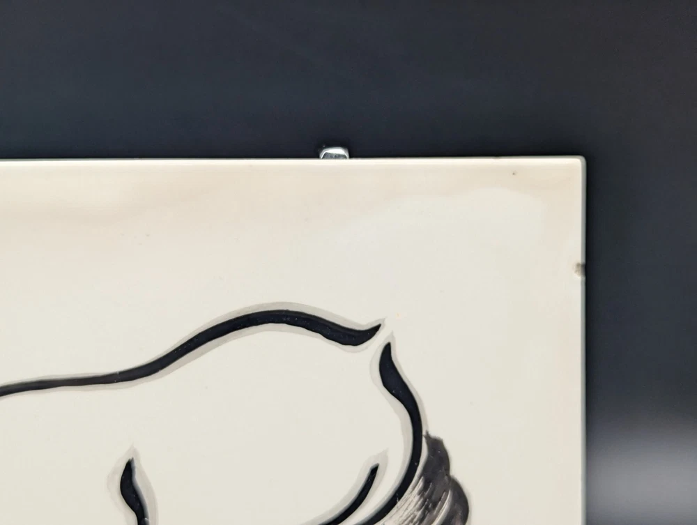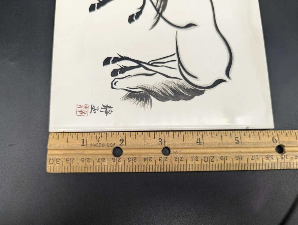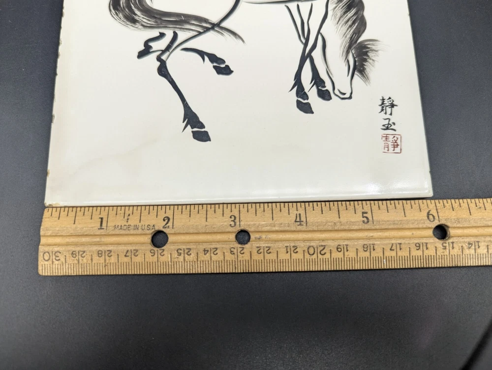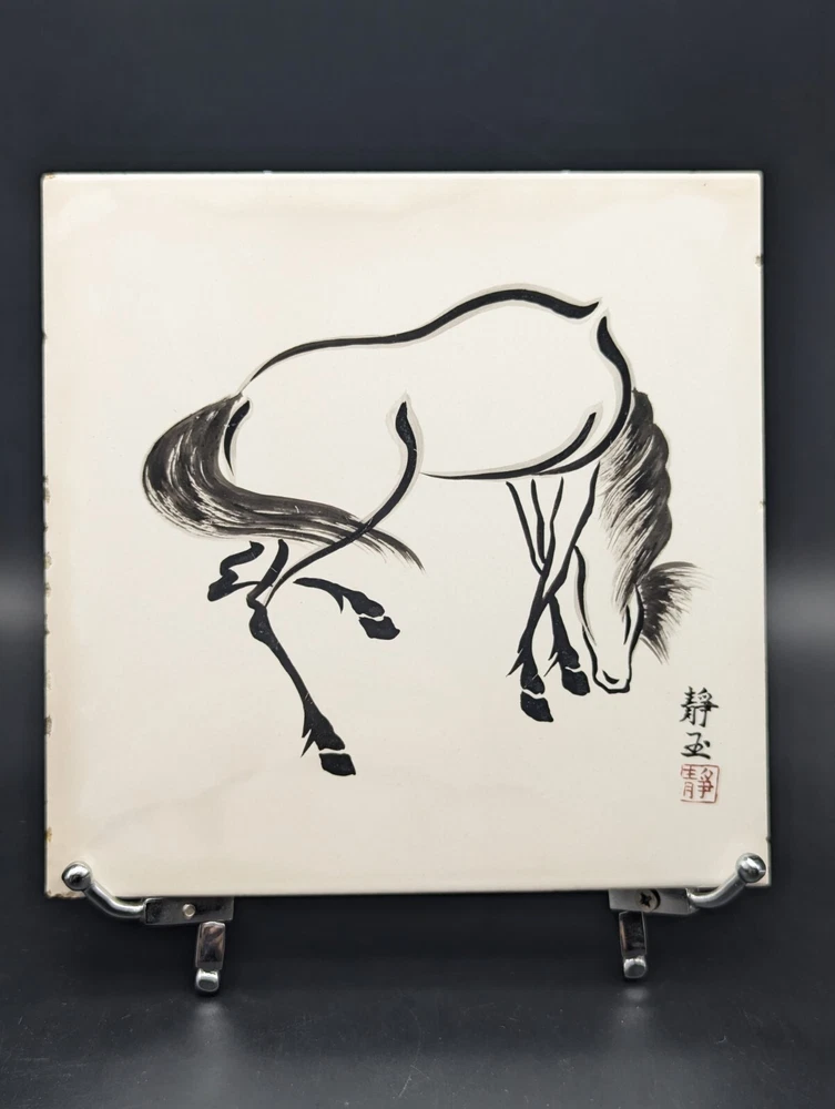 This tile has some discoloration and some chipping around the edges. This vintage Japanese artist's tile features a beautiful horse grazing scene. Measuring 6 inches by 6 inches, the piece is perfect for wall art or as a trivet. The ceramic material and Asian style make it a unique addition to any collection. The item is suitable for all occasions and is perfect for adults. It is a printed finish and is by artist Urushibara Mokuchu. This collectible is a must-have for horse lovers and collectors alike.