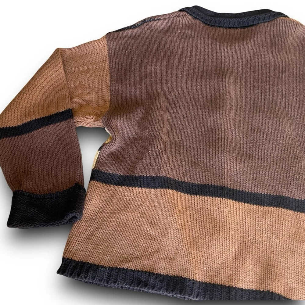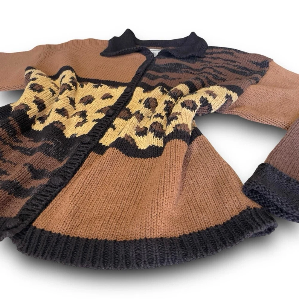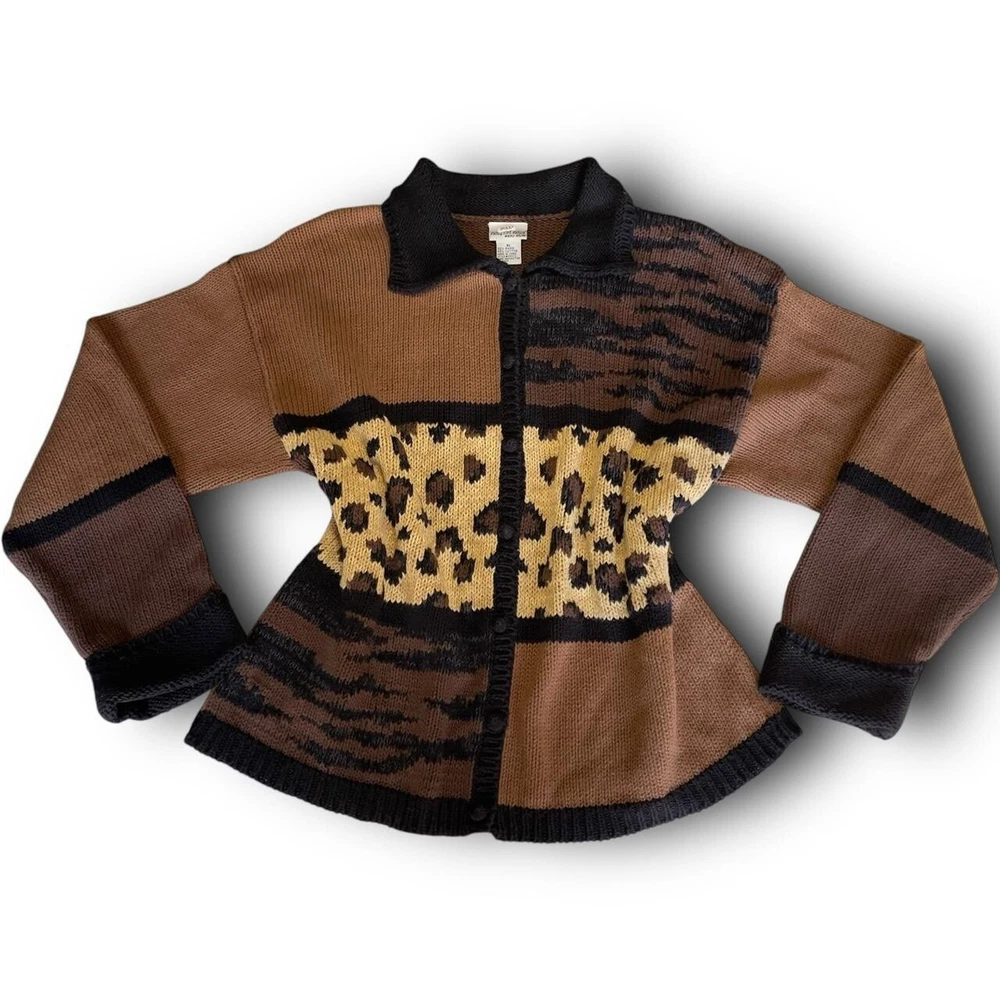 vtg animal print patchwork knit cardigan button up closure ~xl đđŚ 55% ramie 45% cotton vintage 80s 90s absolute precious oversized slouchy grannycore chunky knitted collared brown multicolor cardigan with long sleeves, folded cuffs & button up closure featuring crazy cool wacky leopard & zebra patchwork graphics along w/ retro stripe color block style allover in size xl. itâs giving jersey shore meets academia mob wife vibes⨠laid flat: chest 20â length 23â sleeves 20â vintage retro winter knits crochet animal print leopard zebra colorblock grannycore folklore muted cozy oversized multicolor chunky knit goblincore cottage farmhouse graphic bold fall urban grunge downtown pullover sweatshirt cardigan