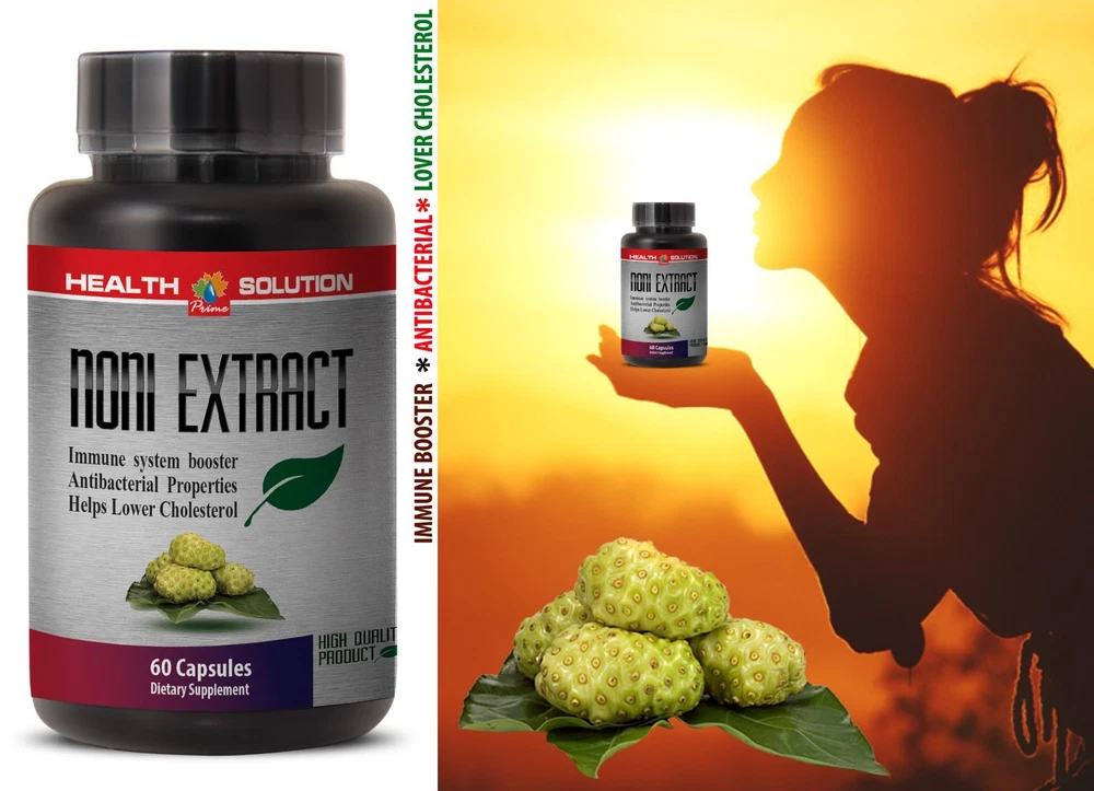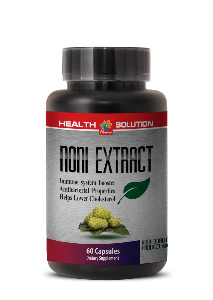 NONI EXTRACT IMMUNE SYSTEM BOOSTER ANTIBACTERIAL PROPERTIES SUPPORTS LOWER CHOLESTEROL ENDURANCE SUPPORT PROMOTES BETTER MEMORY DIGESTION SUPPORT SKIN HEALTH SUPPORT MUSCLE FUNCTION SUPPORT NONI EXTRACT: Noni is a small, evergreen tree found in the Pacific Islands, Southeast Asia, Australia and India that often grows among lava flows. Known as an herb for numerous conditions, noni has been used to make dyes for clothing as well as used for supporting health. The most popular of the remedies is the noni leaf extract, which is used for improving a long list of ailments. Our natural supplement is purely 200MG of noni extract. NONI IMPROVES YOUR IMMUNE SYSTEM: A strengthened immune system is a benefit of noni extract which accentuates its credibility. Noni has been valued for its effectiveness in fighting bad bacteria. These noni components stimulate the activity of white blood cells which play an important role in exerting such a positive effect. Scopoletin in noni possesses anti-bacterial, anti-inflammatory, antifungal, and anti-histamine properties which significantly contribute to sustaining the immune defense mechanism and function. NONI SUPPORTS ENDURANCE: In case constant fatigue is existant, noni may help. For thousands of years, Noni has been used to combat general weakness, boost energy levels and improve the overall physical performance. Noni is a time-honored herb and was traditionally used by Polynesians to combat general weakness and advancing quality of life and energy levels. NONI SUPPORTS CELLULAR WELL-BEING: Noni contains colorless alkaloids that aid cellular repair and help maintain a healthy balance. It also contains small amounts of xeronine, an alkaloid specifically supports cell health and function. Noni juice is also known to help in the support of connective tissues function and structural support. The xeronine in noni can also help regenerate cells and offer anti-aging benefits. NONI IMPROVES YOUR MEMORY: Noni fruit has protective properties that help stop memory retention problems. Noni juice may exert a supportive effect in helping you retain more information for longer duration. Research studies conducted on subjects with weakened memory functions have suggested that consumption of noni juice may encourage cerebral blood flow and helps to improve memory functions. NONI PROMOTES MUSCLE FUNCTION: Some research talks about the presence of potassium ions in noni juice. These potassium ions induce muscle contractions and stimulate the blockage of calcium channels. And this results in the calming of muscle spasms. Noni fruit has relaxing properties for the muscles. The research shows that Noni fruit possesses an antispasmodic property that helps to block the voltage dependent calcium channels. It helps to suppress the spasms of muscles and calms the discomfort and pain. NONI WORKS FOR HEALTHIER SKIN: Noni juice may be regarded as a natural aid in beauty and skin care. Studies suggest that noni is rich in protective factors, anthraquinones which exert collagen building effects and may slow or reverse the formation of wrinkles on the skin. The presence of essential fatty acids and component proxeronine, which is a precursor to the alkaloid xeronine in noni, supports the efficient functioning of cell membranes, tends to normalize abnormal cells, and helps restore healthy skin. NONI FOR IMPROVEMENT IN DIGESTION: Noni juice is particularly rich in vitamin A, protein, calcium, and iron – nutrients important for the digestive system. In case you are suffering from a case of sluggish digestion or slow bowel movement, noni can set things right. The juice can exert a stimulating effect. Noni may help your digestion muscles to contract and expand ultimately pushing the digesting matter onward. SUGGESTED USE : 1 (One) capsule taken 1 to 2 times daily preferably with meals or as directed by a healthcare professional Supplement Facts Serving Size: 1 Capsule Servings Per Container: 60 Noni (8:1 concentrate) 500mg * *% Daily Value not established. OTHER INGREDIENTS: Gelatin (bovine), rice flour and vegetable magnesium stearate. Manufactured Exclusively For: HEALTH SOLUTION USA, LLC 60 Capsules Dietary Supplement Antibacterial Properties Do not exceed recommended dose. Pregnant or nursing mothers, children under 18, and individuals with a known medical condition should consult a physician before using this or any dietary supplement. PREMIUM QUALITY PRODUCT