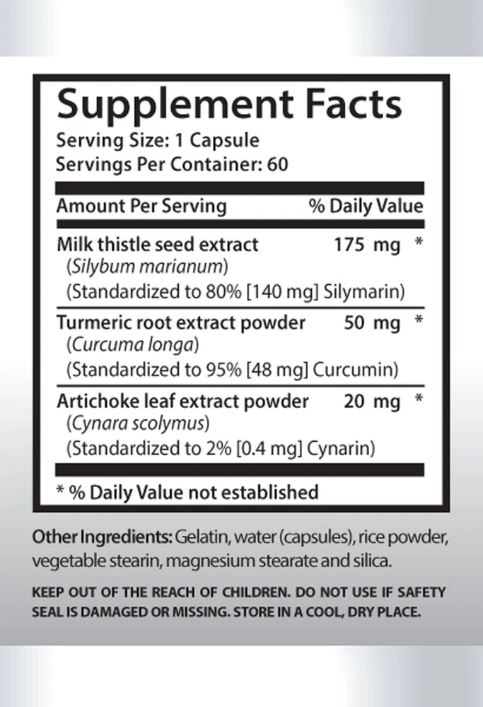 MILK THISTLE Powerful Antioxidant Anti-Aging Properties Made in USA 3 Bottles 180 Capsules Benefits: ANTI-AGING HEALTH SUPPORT HEART HEALTH WEIGHT LOSS INFLAMMATION AID MILK THISTLE : Milk thistle is a natural herb that has antioxidant and anti-inflammatory properties. Our natural supplement is made up of Milk Thistle Seed Extract, Turmeric root extract powder, and Artichoke leaf extract powder. ANTI-AGING : Because milk thistle’s antioxidants help stop free radical damage through you and remove pollutants and waste from the blood and digestive tract, it can actually slow the aging process. Milk thistle’s supportive qualities of the skin make it great for reducing visible signs of aging. HEALTH SUPPORT : While it has many different benefits, milk thistle is most well-known for being a natural liver supporter. As an antioxidant, milk thistle is equally powerful to other important nutrients like vitamin E or vitamin C, which help fight free radical damage and slow the aging process. It contains high levels of lipophilic extracts from the seeds of the plant, which act as antioxidants that increase immunity and slow down oxidative stress. HEART HEALTH : There are a few different angles by which turmeric can boost your cardiovascular health – curcumin and vitamin B6. Milk thistle appears to raise levels of beneficial cholesterol also, silymarin may also help reduce blood pressure. TURMERIC : Curcumin has powerful antioxidant effects. It neutralizes free radicals on its own, then supports your own antioxidant enzymes. Curcumin may boost levels of the brain activity which increases the growth of new neurons and supports various processes in the brain. Its anti-inflammatory properties accelerate the healing of a cut and soothe skin irritation. WEIGHT LOSS : The golden spice, turmeric, helps accelerate the metabolism rate and lets you burn a significant number of calories, leading to weight loss. It is also useful in reducing fat mass, which is essential contributor when it comes to diet-induced weight loss efforts. ARTICHOKE LEAF BENEFITS : Artichoke Leaf Extract may stimulate bile production, which enables fat digestion and absorption of fat-soluble vitamins from food. The boost in bile production from the cynarin found in artichoke extract supports the liver. Artichokes also contain a flavonoid named silymarin, a powerful liver support. INFLAMMATION AID : With the combination of anti-inflammatory properties of milk thistle and turmeric our natural supplement can be relied on for calming inflammatory responses. Also, with curcumin, turmeric can be an ideal weight-loss supplement as it lowers bad cholesterol levels and is responsible for suppressing inflammatory messages in muscle, pancreatic, and fat cells. Supplement Facts Serving Size: 1 Capsule Servings Per Container: 60 Amount Per Serving % Daily Value Milk thistle seed extract (Standardized to 80% [140 mg] Silymarin) 175 mg * (Silybum marianum) Turmeric root extract powder (Standardized to 95% [48 mg] Curcumin) 50 mg* (Curcuma longa) Artichoke leaf extract powder (Standardized to 2% [0.4 mg] Cynarin) 20 mg * (Cynara scolymus) * % Daily Value not established Other Ingredients : Gelatin, water (capsules), rice powder, vegetable stearin, magnesium stearate and silica. KEEP OUT OF THE REACH OF CHILDREN. DO NOT USE IF SAFETY SEAL IS DAMAGED OR MISSING. STORE IN A COOL, DRY PLACE. SUGGESTED USE : As a dietary supplement, adults take one (1) capsule, three (3) times daily, or as directed by your health care professional. CAUTION: Do not exceed recommended dose. Pregnant or nursing mothers, children under the age of 18 and individuals with a known medical condition should consult a physician before using this or any dietary supplement. These statements have not been evaluated by the Food and Drug Administration. This product is not intended to diagnose, treat, cure or prevent any disease. GREAT QUALITY SUPPLEMENTS
