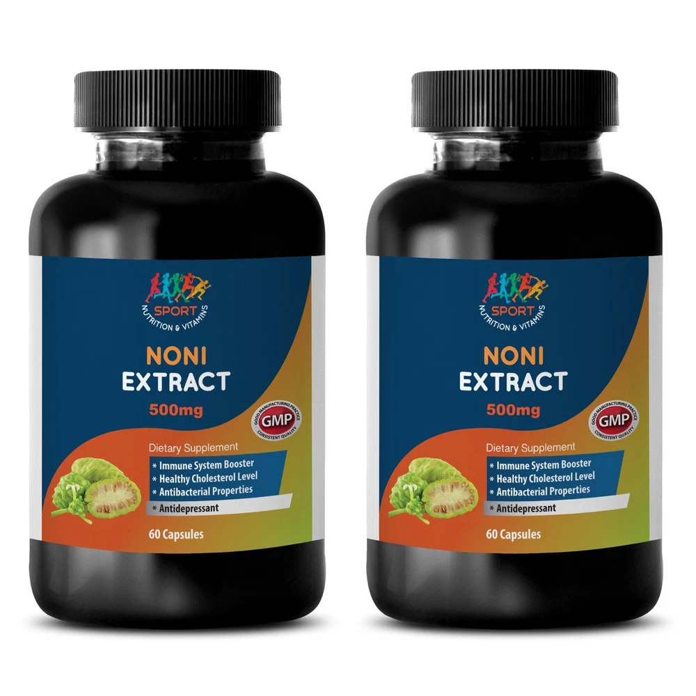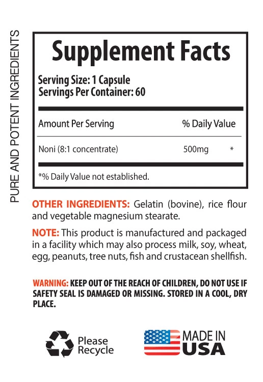 NONI EXTRACT (8:1 CONCENTRATE) 500MG Anti-Aging, Antioxidant & Anti-Inflammatory Immune System Booster Immune System Booster Help Improve Memory, Digestive Stimulant Excellent Antioxidant Antibacterial Properties Helps Lower Cholesterol Promote Increase Of Fat Oxidation And Metabolism 2 Bottles, 120 Capsules Made In USA NONI EXTRACT: Noni is a small, evergreen tree found in the Pacific Islands, Southeast Asia, Australia and India that often grows among lava flows. Known as a folk remedy for numerous treatments, noni has been used to make dyes for clothing as well as medicine. The most popular of the remedies is the noni leaf extract, which is used for improving a long list of ailments. Our natural product is purely 200MG of noni extract. SKIN HEALTH SUPPORT: Noni juice may be regarded as a natural aid in beauty and skin care. Studies suggest that noni is rich in protective factors, anthraquinones which exert collagen stimulating effects and may stop the formation of wrinkles on the skin. The presence of essential fatty acids and component proxeronine, which is a precursor to the alkaloid xeronine in noni supports the efficient functioning of cell membranes, tends to normalize abnormal cells, and helps restore healthy skin. BOOSTS IMMUNITY: A strengthened immune system is yet another benefit of noni extract which accentuates its credibility. Noni has been valued for its effectiveness in fighting infections. These helpful components stimulate the activity of white blood cells which play an important role in exerting such protective effect. Scopoletin in noni possesses anti-bacterial, antimutagenic, anti-inflammatory, antifungal, and anti-histamine properties which significantly contribute to sustaining the immune defense mechanism. BOOST MEMORY: Noni fruit has protective properties that help stop memory problems. Noni extract may exert a protective effect in stoppping the problems of memory impairment. Research studies conducted on subjects with weakened memory functions have suggested that consumption of noni extract encourages cerebral blood flow and helps to improve memory functions. ENERGY BOOST: In case constant fatigue is making your life miserable, noni can help. For thousands of years, Noni has been used to combat general weakness, boost energy levels and improve the overall physical performance. Noni is a time-honored medicine and was traditionally used by Polynesians to combat general weakness and advancing quality of life and energy levels. MUSCLE FUNCTION SUPPORTER: Some research talks about the presence of K+ ions in noni extract. These ions induce muscle contractions and stimulate the blockage of calcium channels. And this results in the suppression of muscle spasms. Noni fruit has relaxing properties in the muscles. The research shows that Noni fruit possess an antispasmodic property that helps to block the voltage dependent calcium channels. It helps to suppress the spasms of muscles and calms the discomfort and pain. CELLULAR HEALTH IMPROVEMENT: Noni contains colorless alkaloids that aid cellular repair and help maintain a healthy balance. It also contains small amounts of xeronine, an alkaloid specifically required for cell health and functioning. Noni extract is also known to help in the repair of connective tissues. The xeronine in noni can also helps regenerate cells and offer anti-aging benefits. DIGESTIVE HEALTH IMPROVEMENT: Noni extract is particularly rich in vitamin A, protein, calcium, and iron – nutrients important for the digestive system. In case you are suffering from a case of sluggish digestion or slow bowel movement, noni can set things right. The extract can exert a stimulating effect. Noni may help your instesine muscles to contract and expand ultimately pushing the digesting matter onward. Supplement Facts: Noni (8:1 concentrate) 500mg OTHER INGREDIENTS: Gelatin (bovine), rice flour and vegetable magnesium stearate. NOTE: This product is manufactured and packaged in a facility which may also process milk, soy, wheat, egg, peanuts, tree nuts,fish and crustacean shellfish. Serving Size: 1 Capsule, Servings Per Container: 60 SUGGESTED USE: 1 (One) capsule taken 1 to 2 times daily preferably with meals or as directed by a health care professional CAUTION: Do not exceed recommended dose. Pregnant or nursing mothers, children under 18, and individuals with a known medical condition should consult a physician before using this or any dietary supplement. These statements have not been evaluated by the Food and Drug Administration. This product is not intended to diagnose, treat, cure, or prevent any disease. weight loss supplements - NONI EXTRACT 500MG 2B - noni leaf extract GREAT QUALITY PRODUCT