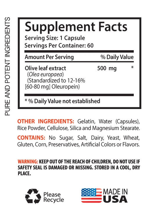 Olive Leaf Extract 500mg Dietary Supplement Made in the United States (2 Bottles, 120 Capsules) Product Description. Olive leaf extract comes from the leaves of an olive plant. It contains an active ingredient called oleuropein. This nutrient is thought to contribute to the anti-inflammatory and antioxidant properties of olive leaf extract. You may have heard how a Mediterranean diet has been linked to a decrease in chronic diseases, especially cardiovascular disease. This is thought to be due to the focus on olive oil, leaves, and fruit in the diet. It's been used as traditional medicine for centuries in countries like Greece, Morocco, and Tunisia. Health Benefits of Olive Leaf Extract: Improves Heart Health. Researchers believe olive leaf extract can have positive effects on atherosclerosis, or narrowing of the arteries, which is the highest risk factor for heart disease. High levels of LDL, or "bad" cholesterol, and total cholesterol are risk factors for developing this disease. One study from 2015 assessed the effects of olive leaf extract on cholesterol levels. Patients who took the extract for eight weeks had significantly decreased cholesterol levels. Lowers Blood Pressure. Olive leaf extract may help lower systolic and diastolic blood pressure. A 2017 study found that olive leaf extract successfully lowered blood pressure. A lower blood pressure can reduce your risk of stroke and heart attack. Weight Loss. Along with heart-healthy benefits and type 2 diabetes protection, it makes sense that olive leaf extract could also help with weight loss. An animal study from 2014 researched the effect of olive leaf extract in preventing high-fat, diet-induced obesity. It's thought that olive leaf extract prevents obesity by regulating the expression of genes that affect weight gain. Anti Inflammatory. The polyphenols in olive leaf extract are antioxidant and anti-inflammatory. In fact, olive leaves and their extracts have long been used (orally and topically) throughout the Mediterranean to combat painful, inflamed joints, and arthritis. Supplement Facts Serving Size: 1 Capsule Servings per Container: 60 Olive Leaf Extract - 500mg (Olea europea)(Standardized to 12-16% [60-80mg] Oleuropein) OTHER INGREDIENTS: Gelatin(Bovine), Rice Powder, Cellulose, Silica, and Magnesium Stearate. WARNING: KEEP OUT OF REACH OF CHILDREN. DO NOT USE IF SAFETY SEAL IS DAMAGED OR MISSING. STORE IN A COOL, DRY PLACE. *These statements have not been evaluated by the FDA. This product is not intended to diagnose, cure, treat, or prevent any disease. GREAT QUALITY PRODUCT