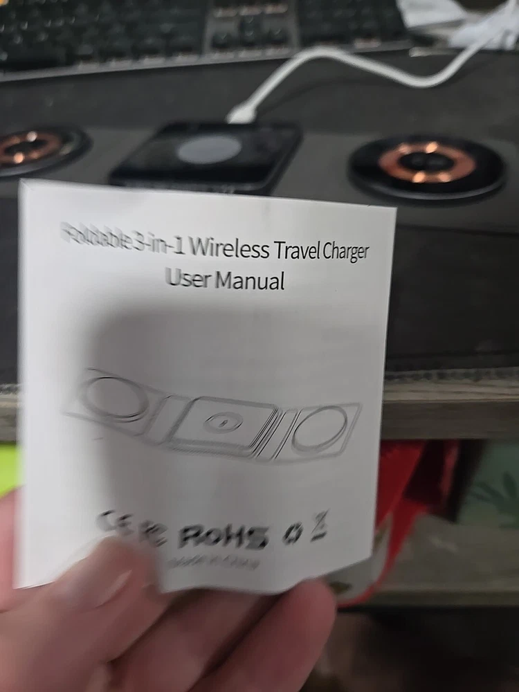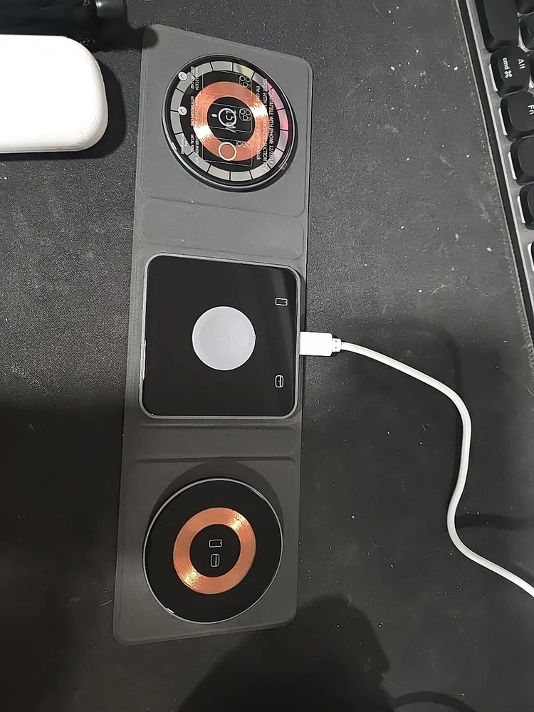 Travel wireless charger. Will charge apple product, per the instructions, and it did charge my android watch and phone. I have no wireless headphones to test but all 3 spots work
