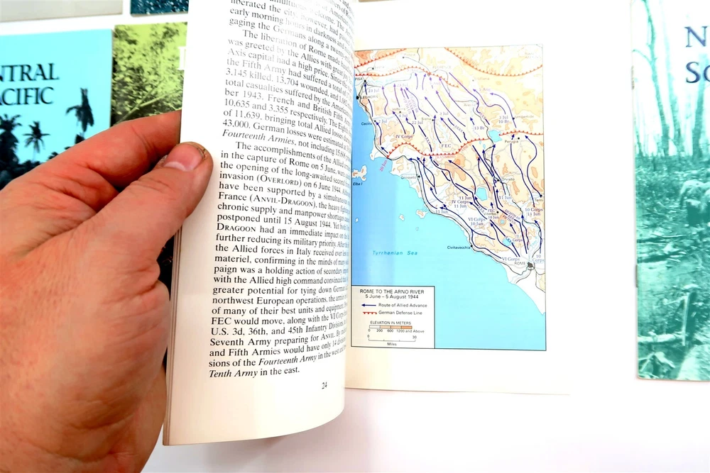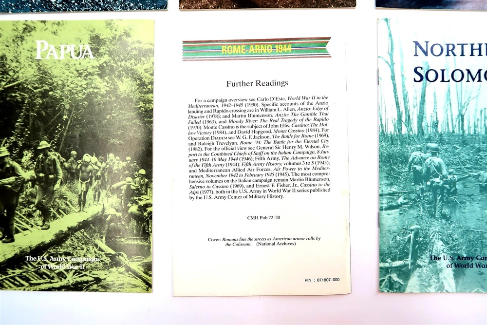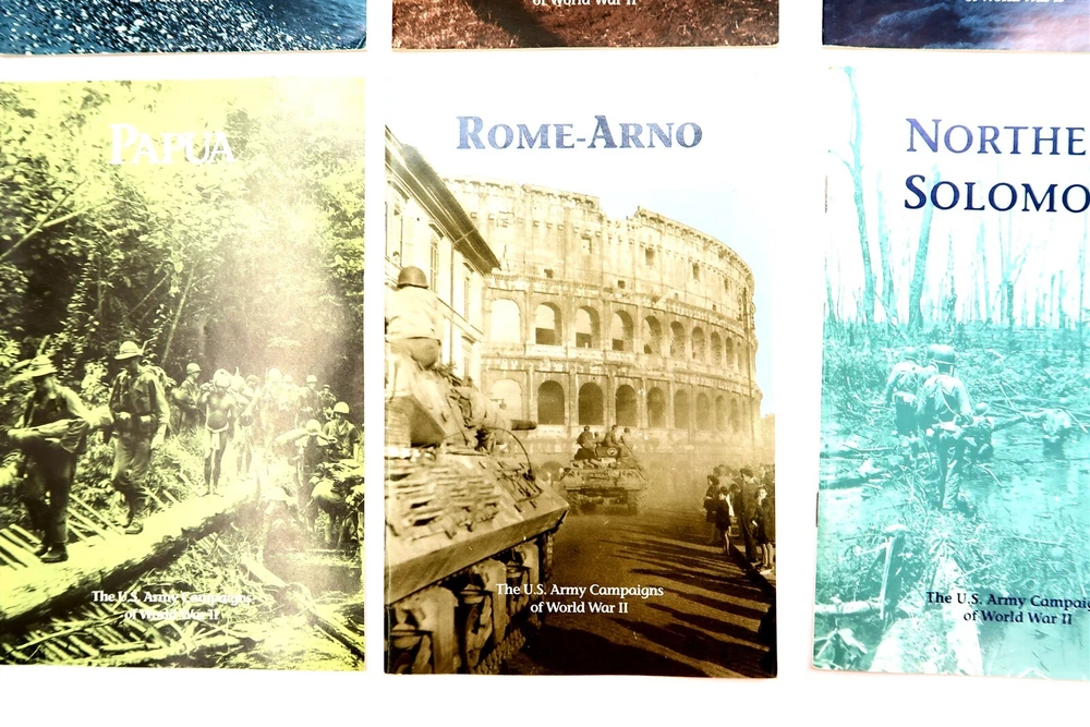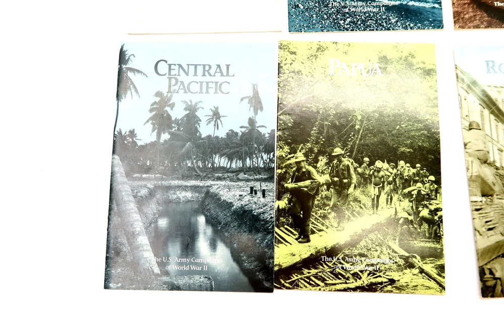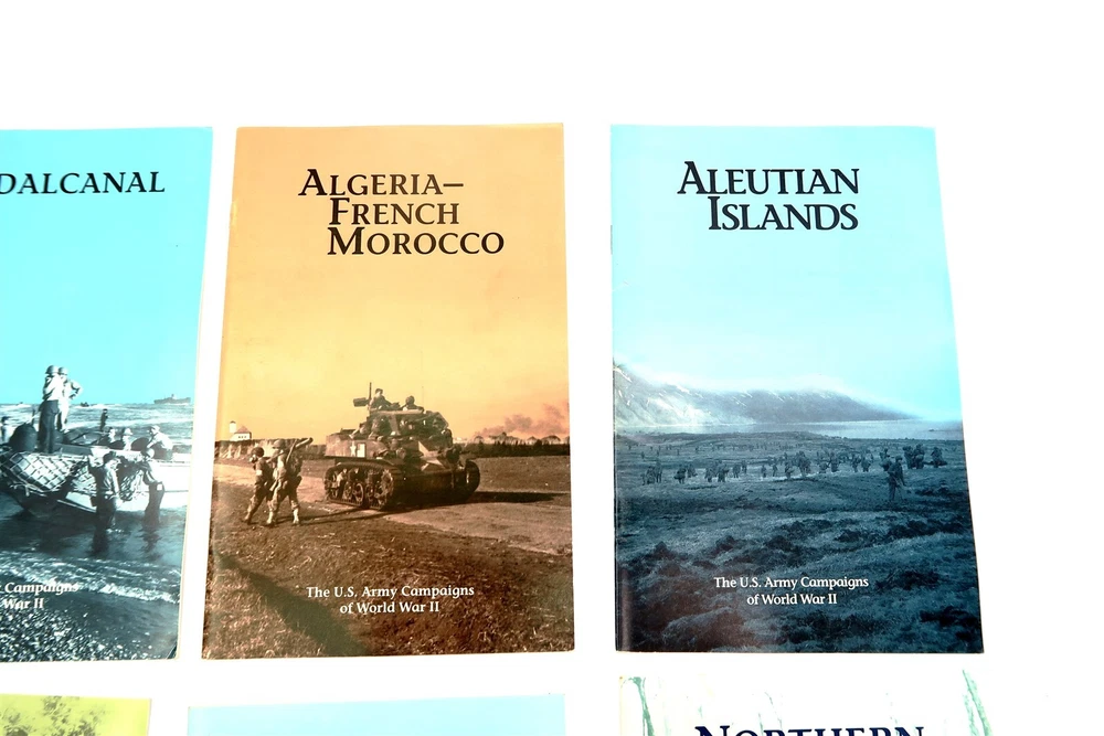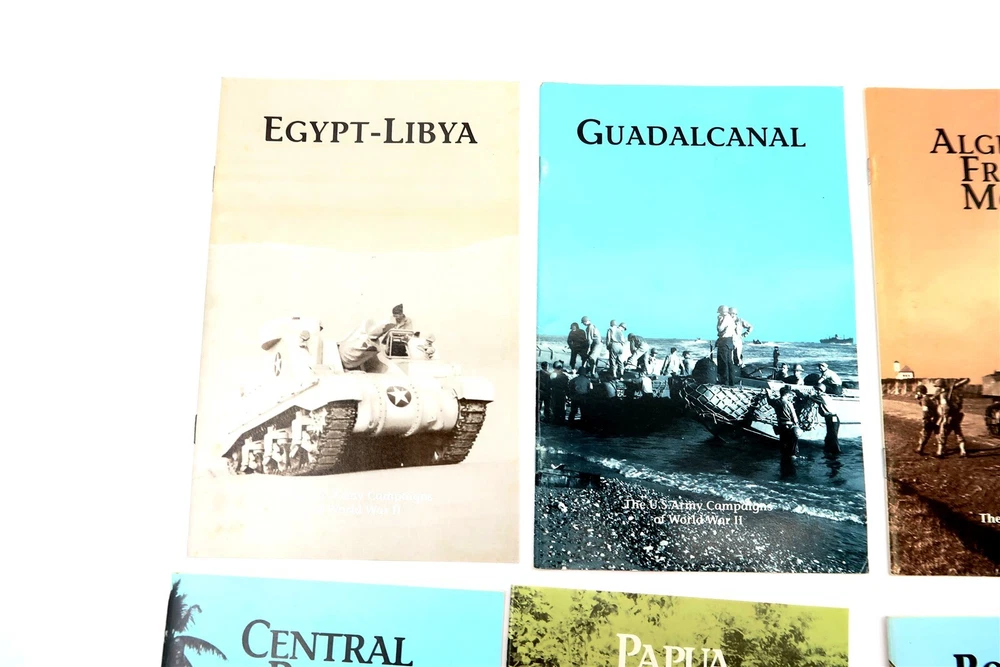 x8 US ARMY CAMPAIGNS OF WORLD WAR II Booklets Egypt, Italy, Papua, Algeria, etc. This eBay listing is for a set of 8 different softback books that are part of the US ARMY CAMPAIGNS OF WORLD WAR II series. Each book measures 8.5" tall and shows to be in very good condition. Age is unknown but I think these are from the 1980's era. Please refer to all the pictures to see what all books are included in this lot. Seller Location Reference - Comics Box 22 BID IN CONFIDENCE – CHECK MY FEEDBACK! My goal is your satisfaction. I leave positive feedback right after the payment is received for all orders!! If you plan to leave anything less than positive feedback and 5 stars - please let me know so that I can work out any problems that you may have. I aim to please!! SHIPPING & HANDLING FOR US BIDDERS We ship ASAP upon payment as noted above within 1 business day 99% of the time!! We normally pack up your new treasures 2 - 3 times a day and ship using USPS and Fedex Ground so that you get your items in a timely fashion. As always - there is no charge for local pickup on any of my items!! SHIPPING AND HANDLING FOR INTERNATIONAL BIDDERS Import duties, taxes and charges are not included in the item price or shipping charges. These charges are the buyer’s responsibility. Please check with your country’s customs office to determine what these additional costs will be prior to bidding/buying.” THANK YOU AND HAVE A WONDERFUL DAY!! Powered by SixBit's eCommerce Solution
