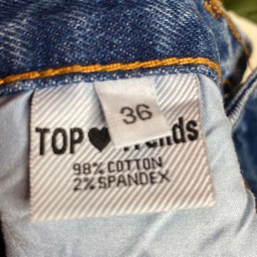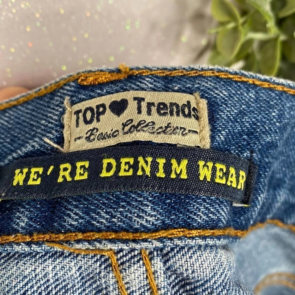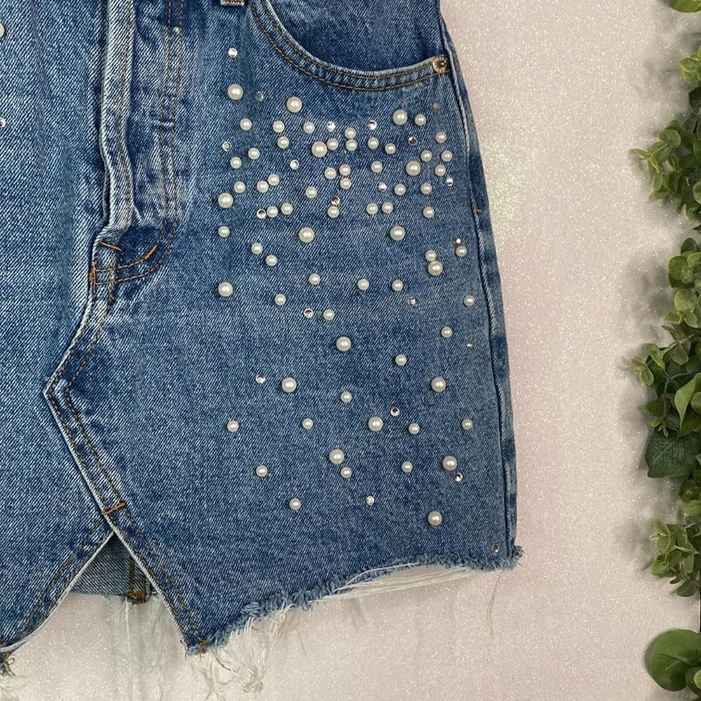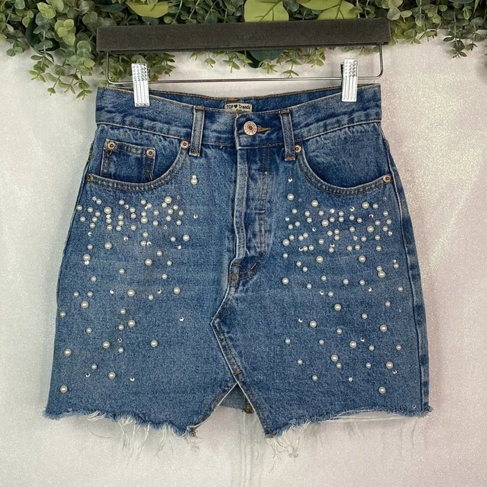 Condition: pre-loved, no visible flaws “Top Trends” Distressed Denim Pearl Mini Skirt Pearl details Zipper & Button closure 5 pockets 98% Cotton , 2% Spandex Size 36 (see measurements) #denim #distressed #mini #pearls #y2k Measurements are approx Waist: 26 inches Length: 15 inches SK35