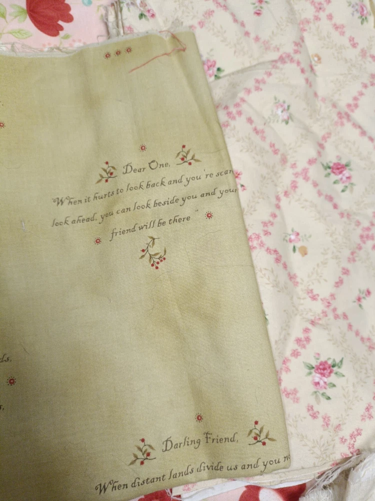 Lovely yellow/beige cotton quilting scrap fabric lot. Fabric is cut in different sizes. Includes florals, vintage motifs, picturesque cartoons, etc. high quality cotton.